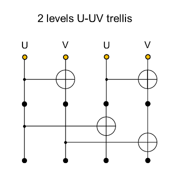 目前已知性能好的中短码包括BCH码、咬尾卷积(TBC)码、极化(polar)码和卷积极化级联(PAC)码,通过特定的译码算法实现高纠错力。例如,分阶级统计译码(OSD)和逐次消元列表(SCL)译码分别使BCH码和循环冗余校验(CRC)级联的极化(CRC-polar)码能够逼近正态近似(NA)界。陈立教授团队另辟蹊径,尝试通过结构化编码构造性能优异的中短码:将一系列短的分量码依特定结构耦合,形成一类特殊的中短码,即U-UV码。这种编码方式使分量码的译码产生合作,为彼此提供丰富的先验信息,从而提升中短码的整体纠错能力,弥补了因码长受限导致的码距较小的缺陷。值得一提的是,陈立教授团队的这种编码尝试是受到了经典编码案例的启发,包括多层编码的逐次消元译码和美国学者Morris Plotkin在1960年提出的二元编码构造方法,也称(U | U + V)构造(U-UV是(U | U + V)的简化表达)。两层的U-UV码构造的格图表示如图1所示。