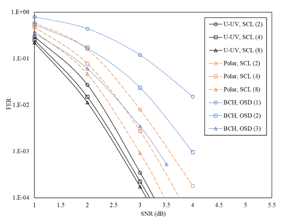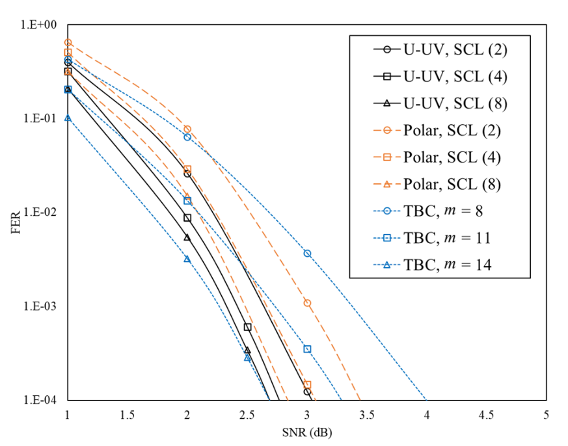 陈立教授团队长期从事信道编码理论和技术研究,近年一直在探索中短码设计和高效译码,陆续取得了一些重要成果。2021年,团队在信息论领域顶会ISIT 发表了题为《BCH based U-UV codes and its decoding》的文章,提出了以BCH码为分量码构造的U-UV码,BCH码可以在极化子信道中(U-UV构造同样产生信道容量极化效应)传输,码率可通过求解极化子信道容量进行适配;同时,利用OSD分量码译码的多元输出特性,设计了针对U-UV码的SCL译码。U-UV码可有效克服中短极化码碰到的理论瓶颈,即信道容量极化不完全,也因此,在SCL译码参数相同时,U-UV码的性能优于CRC-polar码。为了进一步提升设计和译码效率,研究团队随后进一步提出了等(分量码)错误概率准则以调整分量码码率,并提出了低复杂度的SCL译码。团队研究发现U-UV码的纠错能力可超越目前已知的中短好码,除CRC-polar码外,还包括BCH码和TBC码等,如图2-图3所示,展现了其可支撑URLLC工业场景的巨大潜质。上述系统性成果最终发表于2024年2月的IEEE Transactions on Signal Processing期刊上。同时,团队继续深入研究,进一步结合OSD译码跳阶技术与SCL译码剪枝技术,提出了U-UV码的低复杂度SCL译码,这一成果受邀发表在China Communications期刊上。