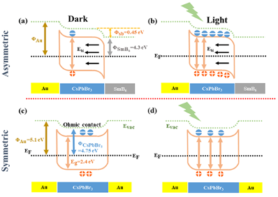 图4. 非对称电极型Au/CsPbBr3/SmB6器件和对称电极型Au/CsPbBr3/Au器件在明暗条件的能带图