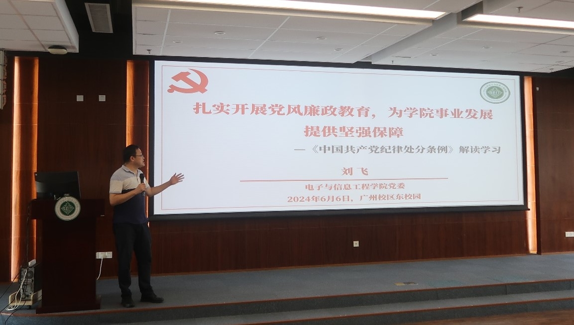 刘飞书记以“扎实开展党风廉政教育,为学院事业发展提供坚强保障”为主题,带领全院教职工学习《中国共产党纪律处分条例》。刘飞书记首先对2023年修订的中国共产党纪律处分条例进行了介绍,并阐明了《条例》修订的重要意义——《条例》是管党治党的重要基础性法规。其次是《条例》修订的亮点解读,包括“把严的基调、严的措施、严的氛围长期坚持下去”、“损失由不可抗力等原因引起不追究党纪责任”、“破坏社会主义市场经济秩序视具体情节给予警告直至开除党籍处分”、“违反有关规定办理因私出国(境)证件、前往港澳通行证,或者未经批准出入国(边)境,视具体情节给予警告直至开除党籍处分”、“弄虚作假,骗取职务、职级、职称、待遇、资格、学历、学位、荣誉、称号或者其他利益的,视具体情节给予警告直至开除党籍处分”等等。最后,刘飞书记指出,要以严明的纪律推进党的自我革命,具体而言,要在服务党和国家大局中学习领会条例修订的主旨要义;加强党纪教育,增强遵规守纪自觉;敢于善于斗争,严格精准执纪。