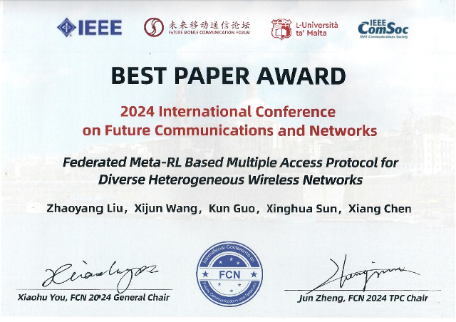 2024年11月18日至22日,第二届未来通信和网络国际会议(FCN2024)在马耳他瓦莱塔成功举行。本次大会由未来移动通信论坛与马耳他大学联合主办,并得到IEEE的技术支持,吸引了来自15个国家和地区的60余所顶尖高等院校、研究机构和企业的专家学者参与。会议覆盖了AI驱动的通信与网络、边缘与云计算、移动无线通信与网络、下一代网络与互联网、以及空天地多域通信等前沿科研方向。18小说王玺钧副教授指导的博士生刘昭炀同学的研究成果“Federated Meta-RL Based Multiple Access Protocol for Diverse Heterogeneous Wireless Networks”荣获最佳论文奖。18小说陈翔教授、华东师范大学郭坤研究员以及18小说 电子与通信工程学院孙兴华副教授为合作作者。