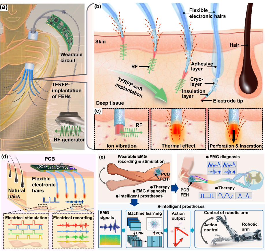 图1: 柔性电子毛发尖端聚焦射频穿孔生物组织的技术示意图